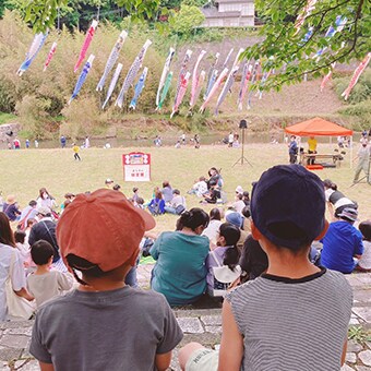 鯉のぼりの下の川では、運が良ければ魚やカニを見つけることができます☆