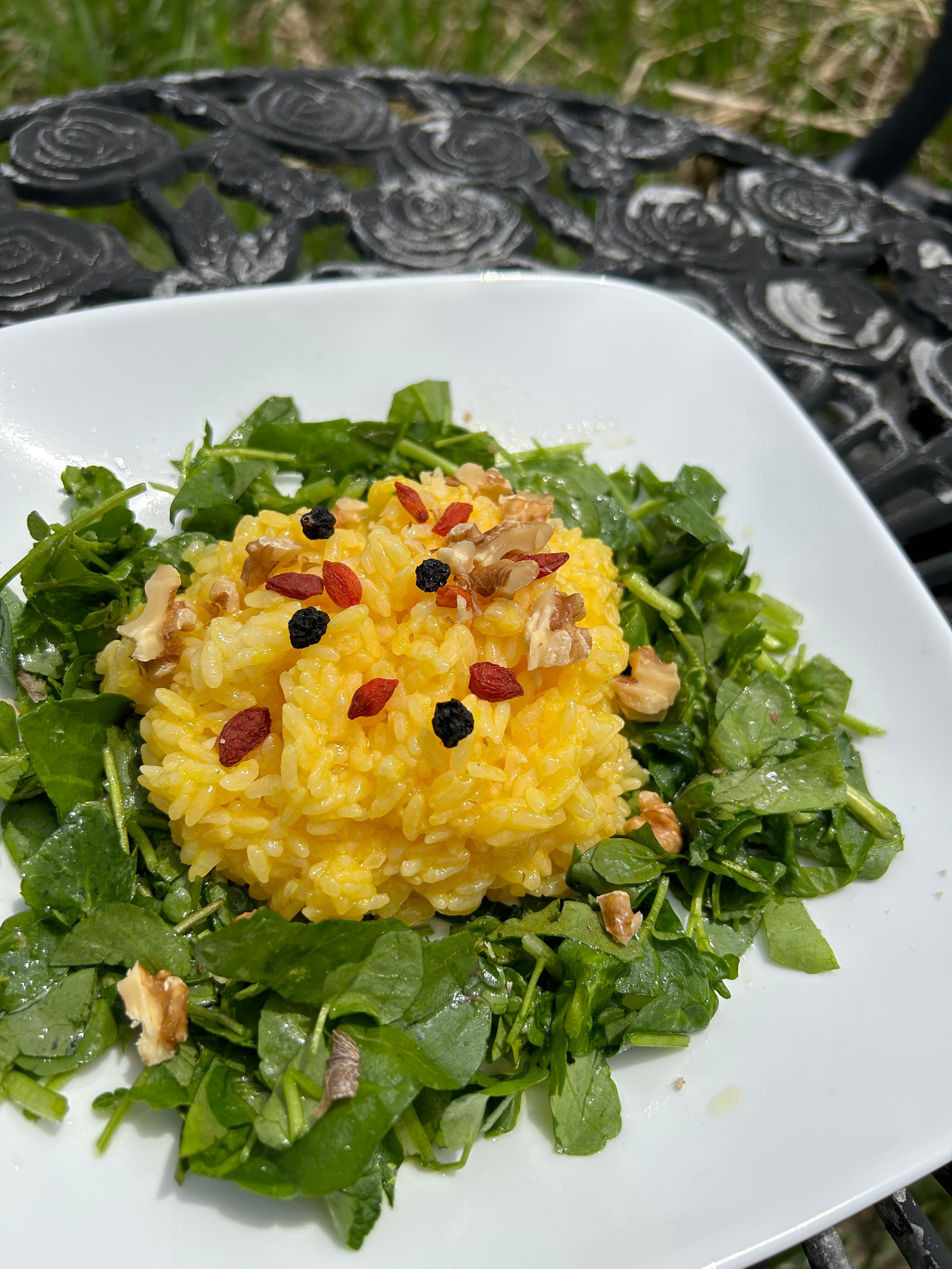 お皿に適当に細かく切ったクレソンに上質のオリーブオイルを垂らして、ミネラルたっぷりのボリビアの紅塩を振って、お茶碗に炊きたてのご飯に安心安全な卵ちゃんを落としてグルグル混ぜて、お皿に盛りつけて、クコの実やナッツを振って完成。