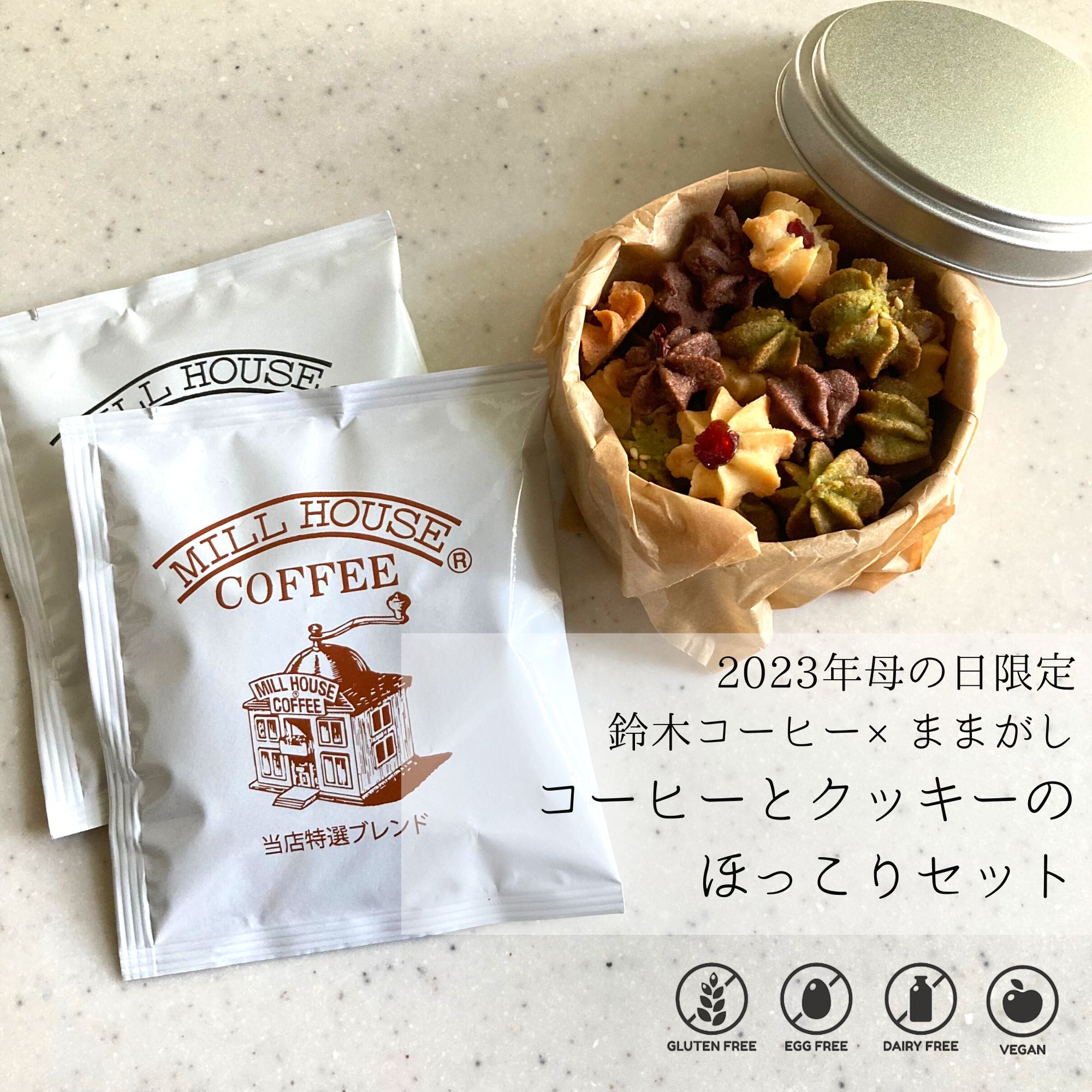 今回は鈴木コーヒーさんのドリップコーヒーと、ままがし のグルテンフリーおやつのセットで2つご用意。