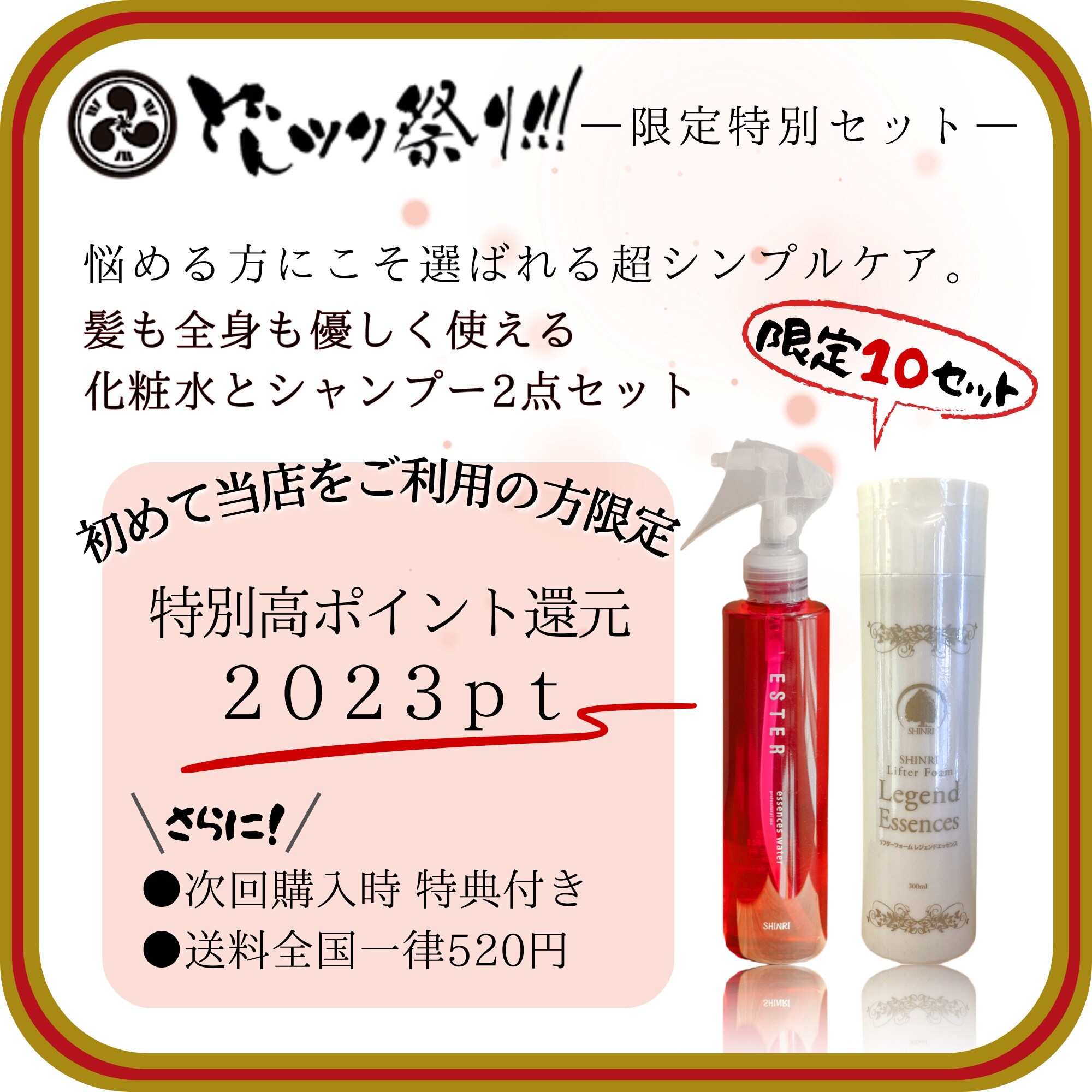 【どんツク祭り!!!限定高ポイント】初回購入限り/エスター200ml&リフターフォーム300ml(全身用化粧水&全身用シャンプー) 次回購入時特典付き/限定10セット無くなり次第終了