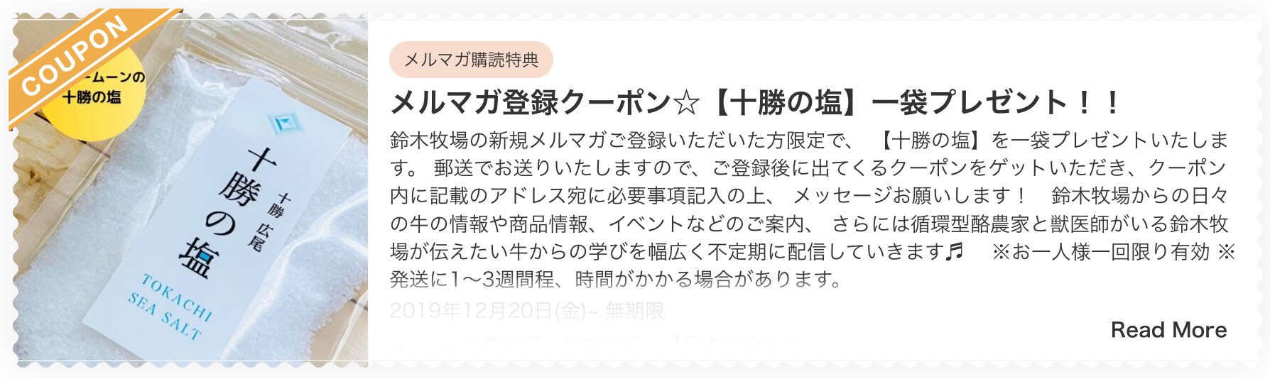 なんと、鈴木牧場さんのメルマガを登録すると、「十勝の塩」が頂けるんです!!