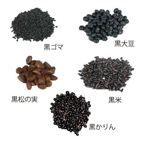 (黒五ペプチド(黒米、黒大豆、黒胡麻、松の実、黒カシス)、黒煎り玄米、フラクトオリゴ糖(特別保健用食品)、野生植物抽出ミネラルマグマ(野生草木・海藻)