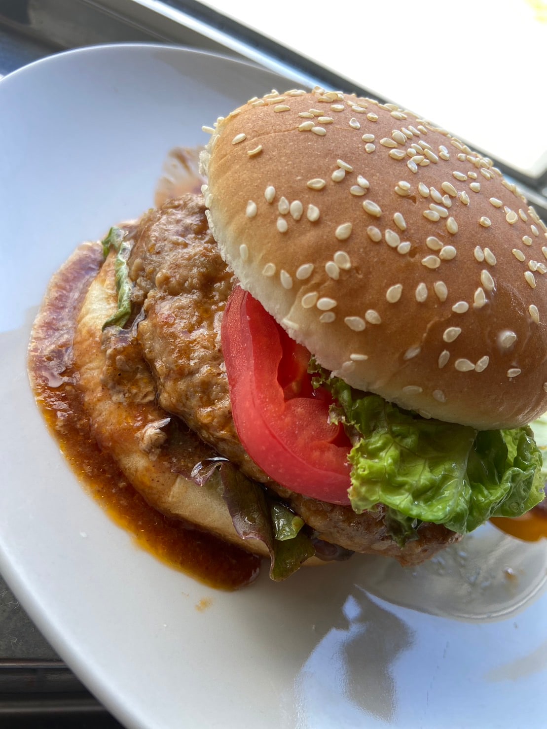 じいちゃんち産のレタス、トマト、そこにあの肉汁プシャーの例のモノをトングで載せて、デミグラスソースをスプーンで載せて出来上がり!