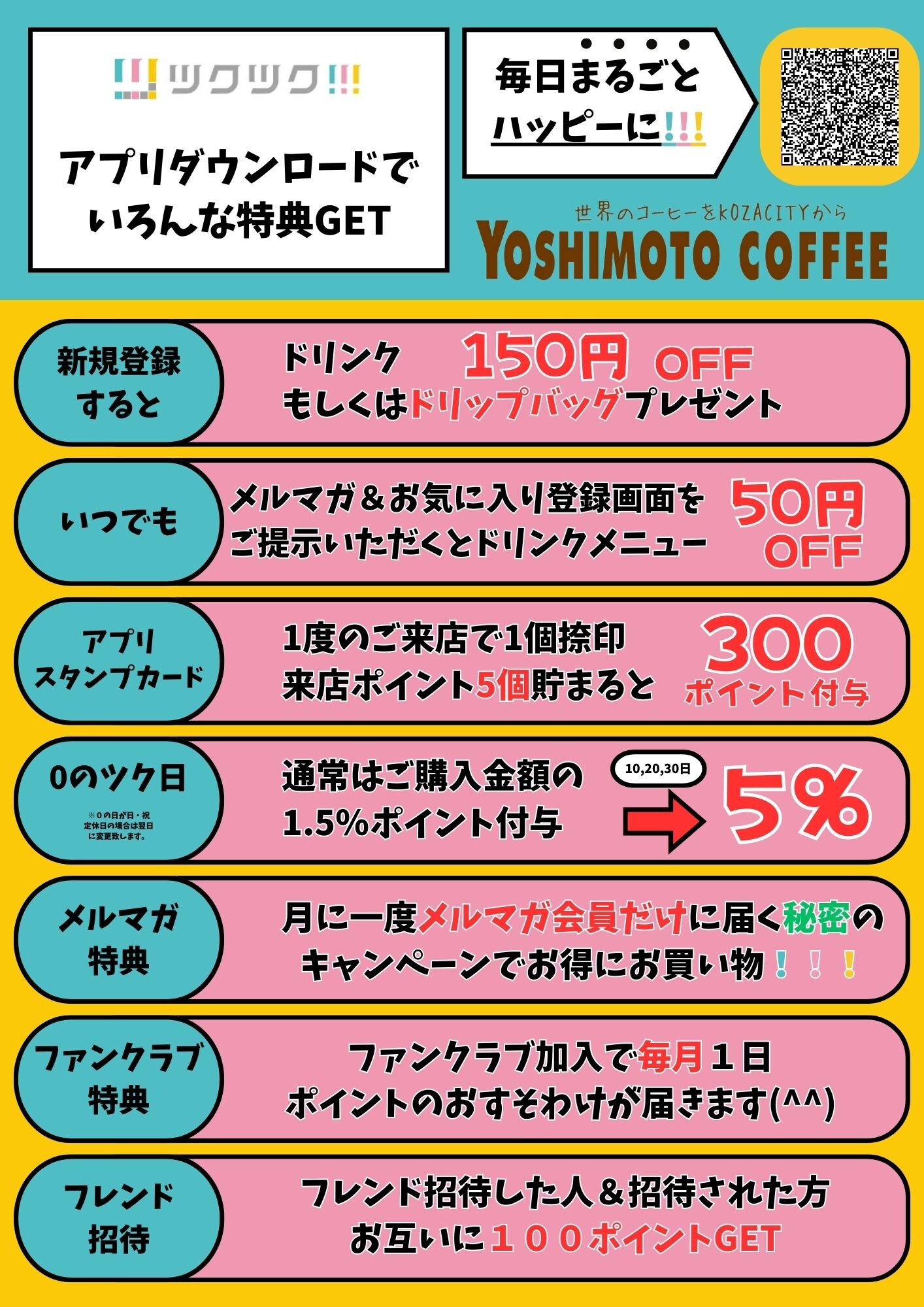 さて、ヨシモトコーヒーでは6月よりツクツクアプリお持ちの方に