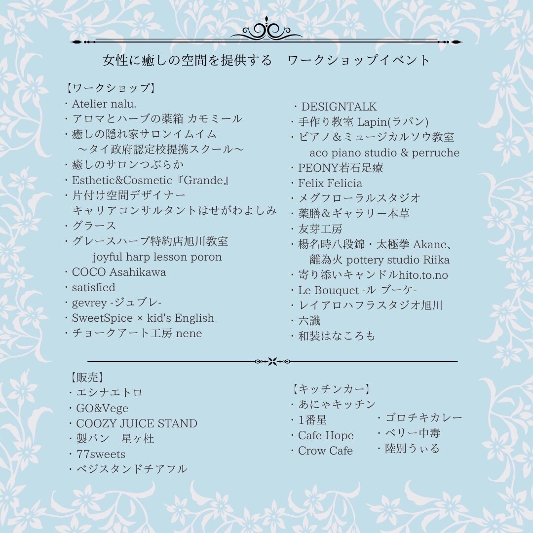 ワークショップや施術系、セッション系、ハンドメイドのアクセサリーや小物、こだわりのスイーツやコーヒーなど多数出店