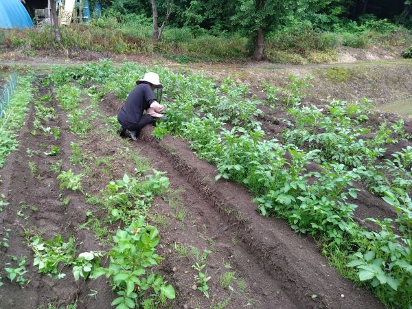 また、ジャガイモとネギ畑の草が伸びて来たので、ジャガイモの芽欠きと畝寄せに勤しみました。