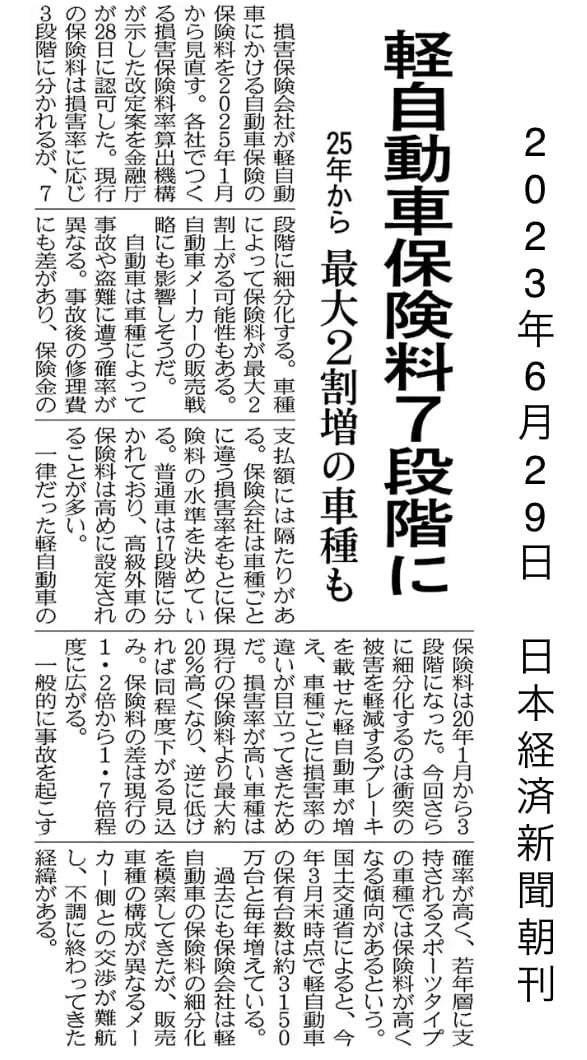 今日は、2025年から軽自動車の保険料が7段階に分けられ、車種によっては最大2割保険料が上がるという記事をご紹介致します。
