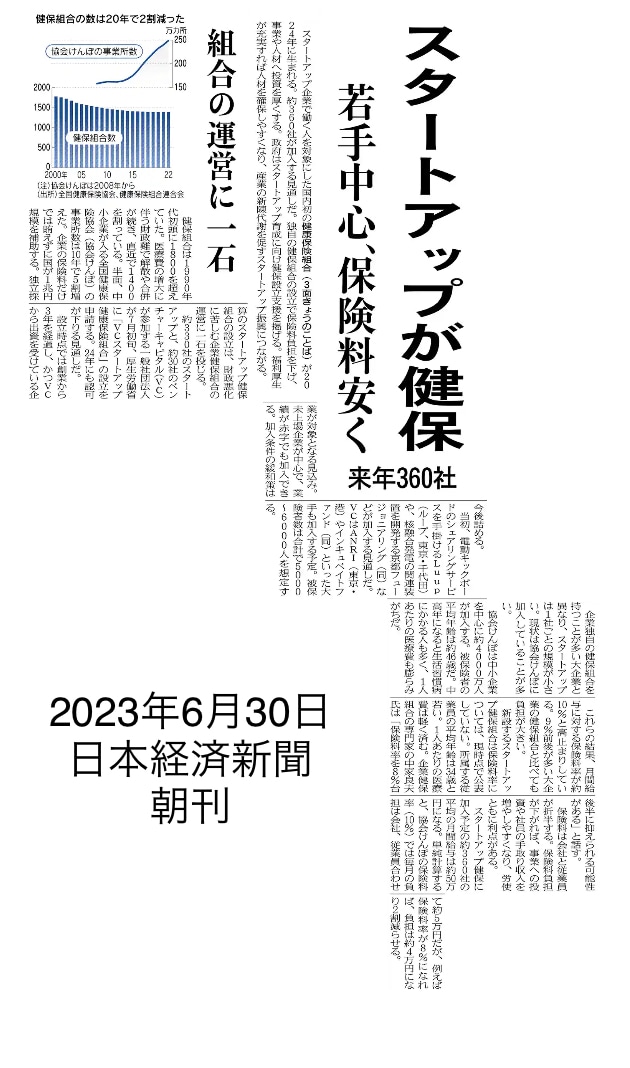 これがなぜ新聞記事になるのか?それは「スタートアップ企業で働く方を対象にした健康組合」と言う仕組みが画期的だからです。この健康組合に参加する企業は、約360社、創業から3年が経ち、かつVC(ベンチャーキャピタル)から出資を受けている企業が対象になります。(ベンチャーキャピタルとはハイリターンを目的とした投資を行う投資会社です。)つまり、この健康組合に参加する企業は、設立まもない会社が多いと言うことなんです。参加企業の平均年齢は34歳と若い事もこの健康保険組合の特徴です。企業の健康組合は2種類あり、「協会けんぽ」と「組合健保」に分かれます。「協会けんぽ」は主に中小企業の会社員が加入。「組合健保」は主に大企業の会社員が加入しています。今回設立されるのは「組合健保」にあたり「協会けんぽ」との違いが「保険料が組合で決められる」と言うこと。「協会けんぽ」は全国で保険料は一律です。又、「協会けんぽ」の平均年齢は46歳と言う事で、生活習慣病などで医療費の負担が増えてくる年頃かと思います。一方で、新しく設立れる健康組合は平均年齢が若い為、病気のリスクも低いため、保険料も抑えられます。新聞記事にあるように協会けんぽの毎月の保険料負担が会社と従業員合わせて5万円(保険料は会社と従業員折半)が、約2割抑えられ4万円との事。保険料が抑えられると会社も福利厚生を充実させることができたり、手取り収入を増やすことも出来ます。この新しい健康保険組合の仕組みが、これからの日本の経済を活性化させる歯車の一つになることは間違いないと思います。このことから、今日は日本経済新聞1面のトップ記事をご紹介させて頂きました。