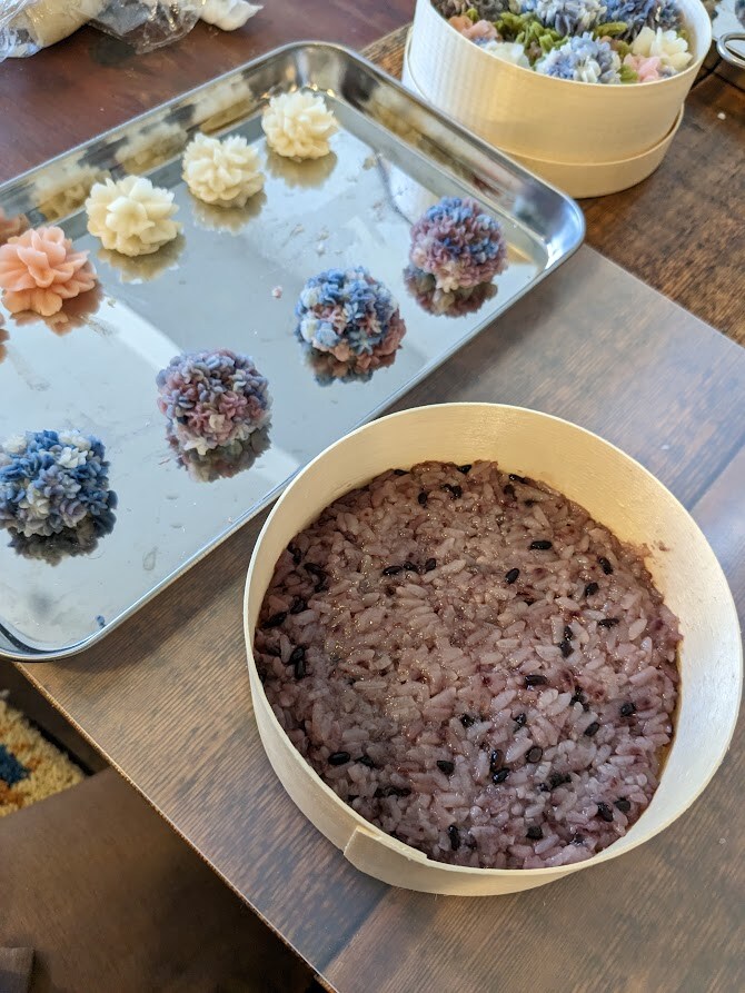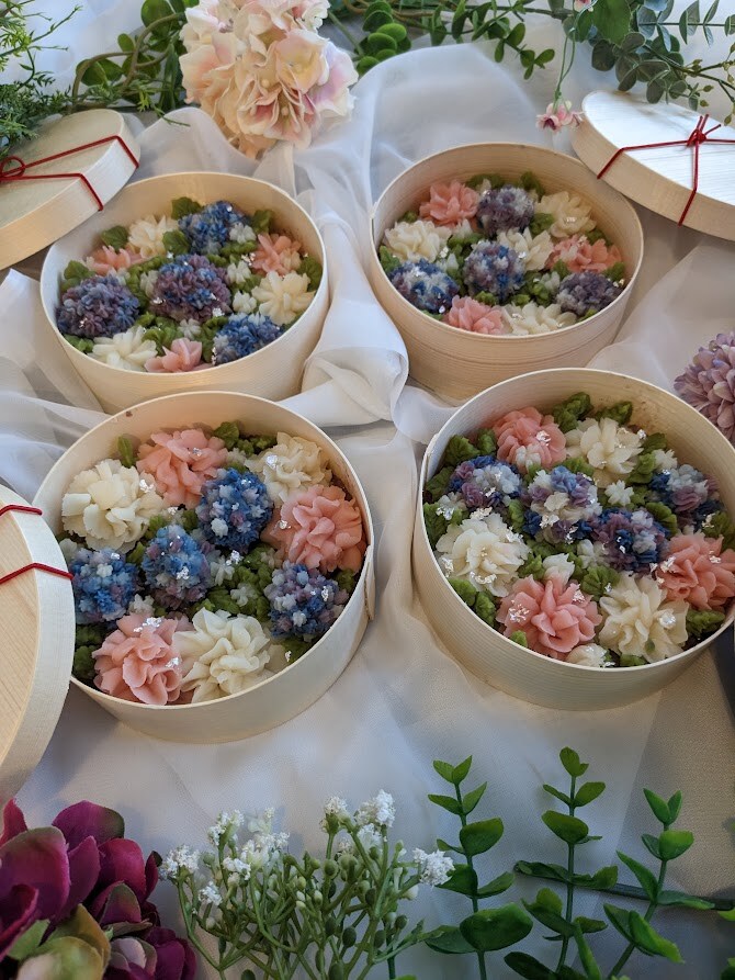 お花を絞り終わったら、曲げわっぱの中に並べていきます。
