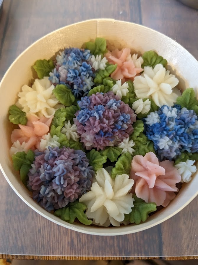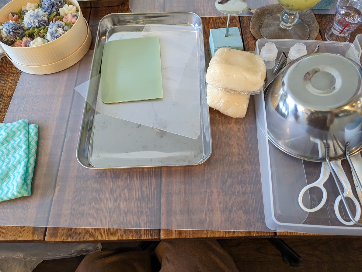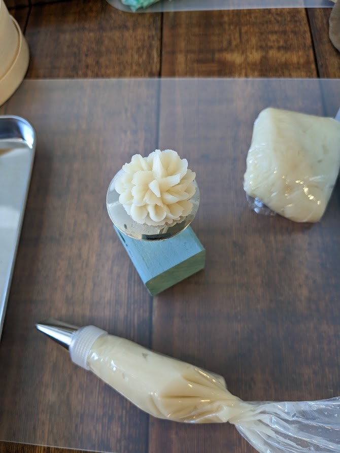 白あんに色を付けて絞り袋でリアルなお花を絞るワークショップを開催しました。