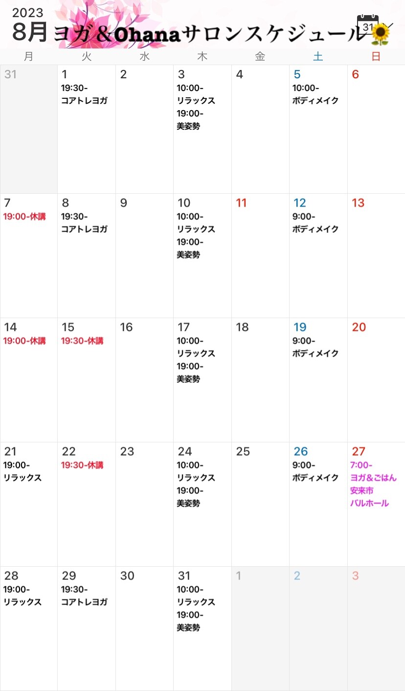 8月Ohanaヨガスケジュールの詳細
