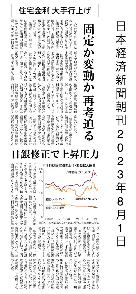 しかし、ここ数ヶ月間、住宅ローンは上昇傾向にあります。新聞にもある様に、大手銀行では固定金利が0.4%、全期間固定型が0.2%~0.3%。変動型も今後は上がる可能性が出てきています。