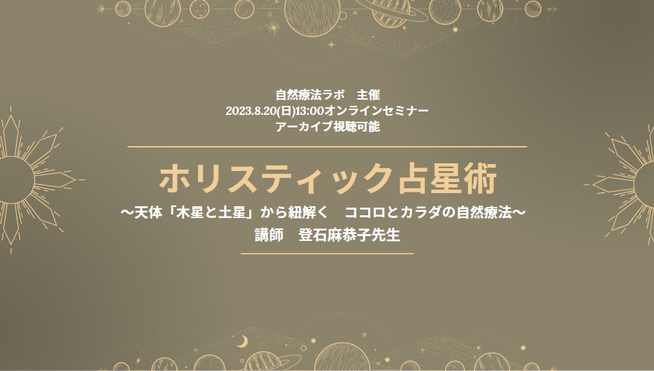 ●7ヘルパーズ&プラネット(天体)の関連を見る「ホリスティック占星術(天体編)」講座は、月、太陽&水星、金星&火星が終わり、8/20に木星&土星が開催になります。
