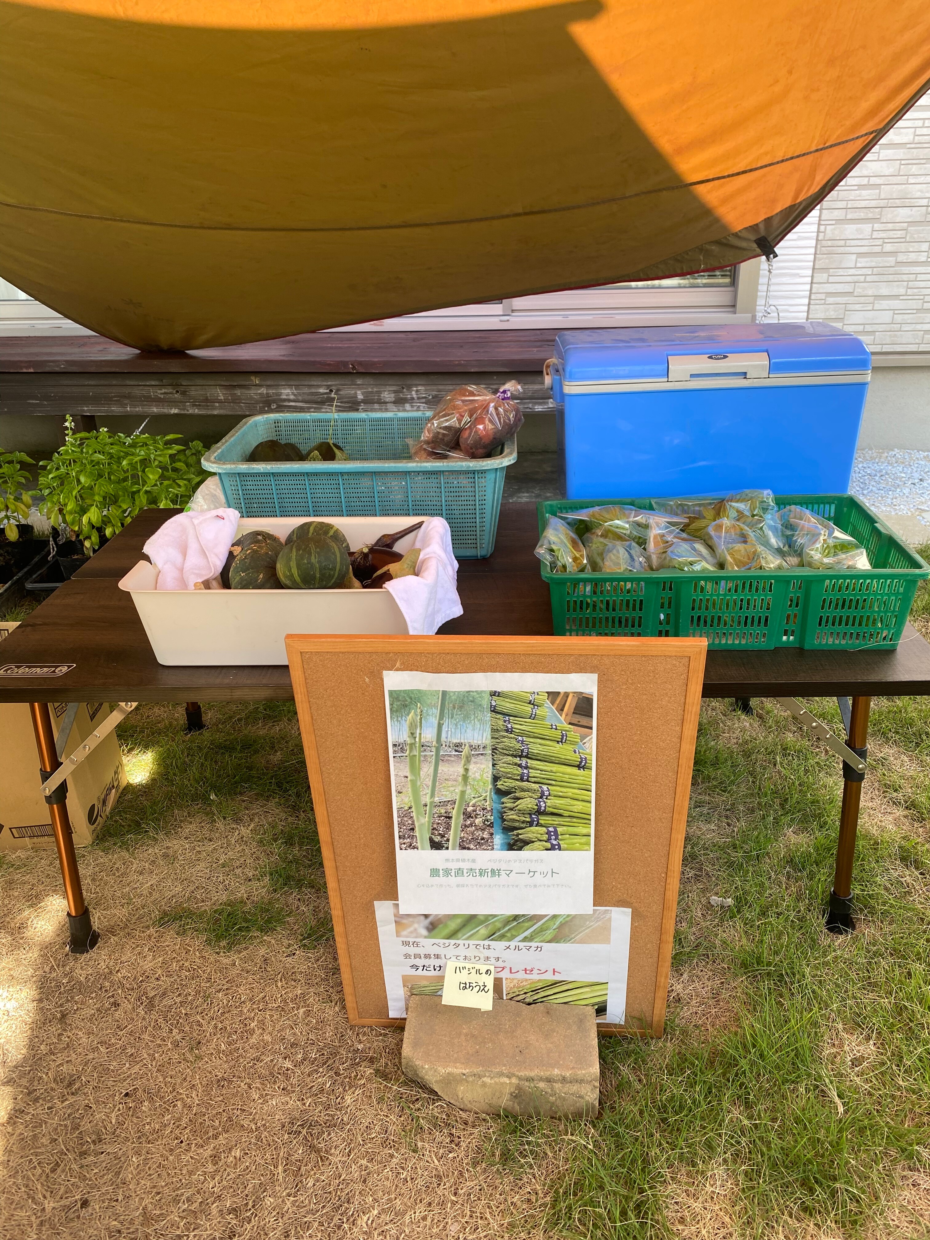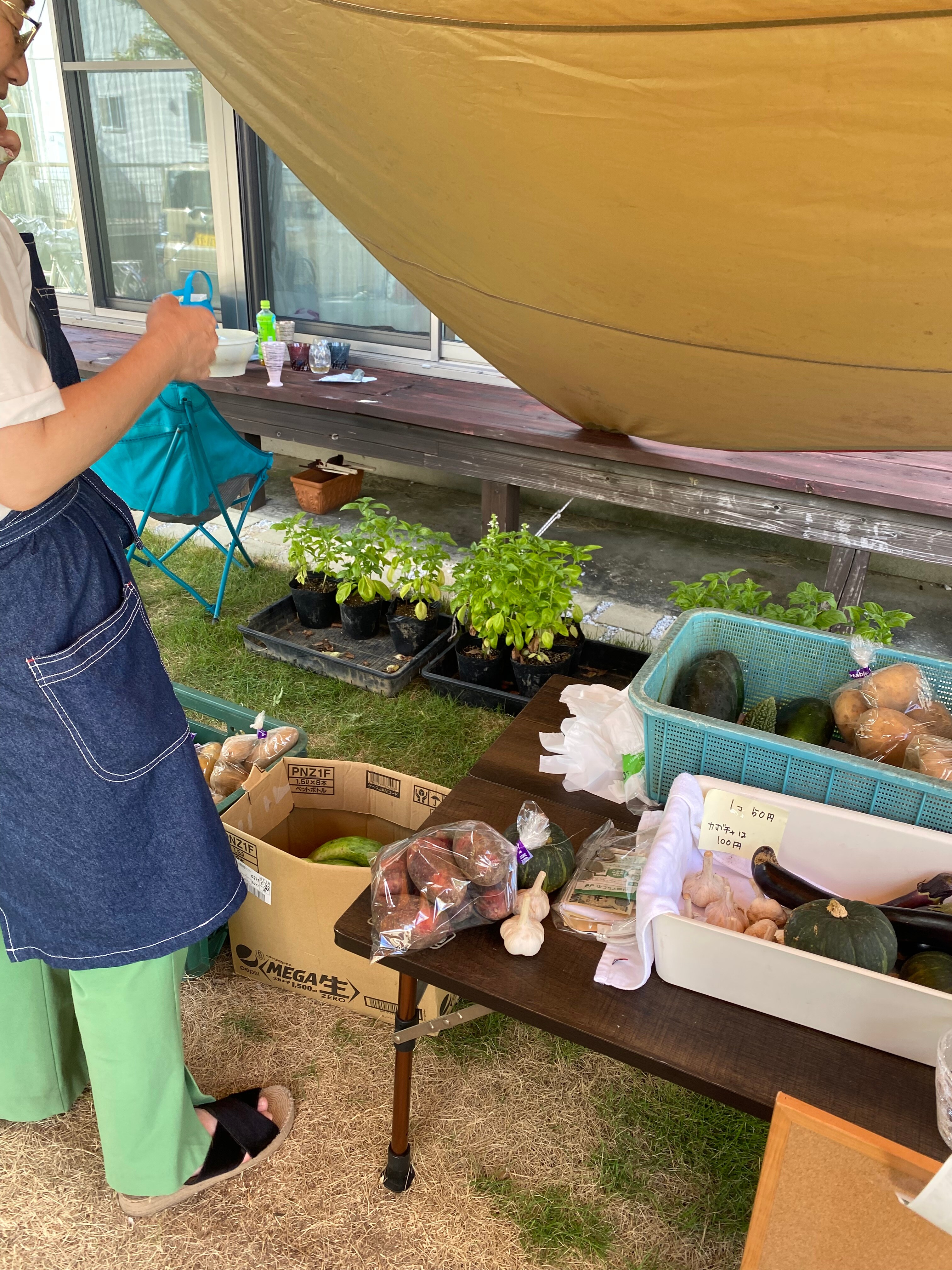 8月4日の15時〜16時で、個人のお宅のお庭をお借りして、「ご近所様、いらっしゃい」のベジタリ☆マルシェをしました。アスパラガス、ジャガイモ、かぼちゃ、ナス、ニンニク、地きゅうり、青うり、バジルを販売しました。貸していただいた方のご近所の方が来られて、会話もはずみ楽しいマルシェでした♪LINE登録していただいた方にバジルの鉢植えプレゼントも好評でした。おいでいただいた、お客様ありがとうございました。