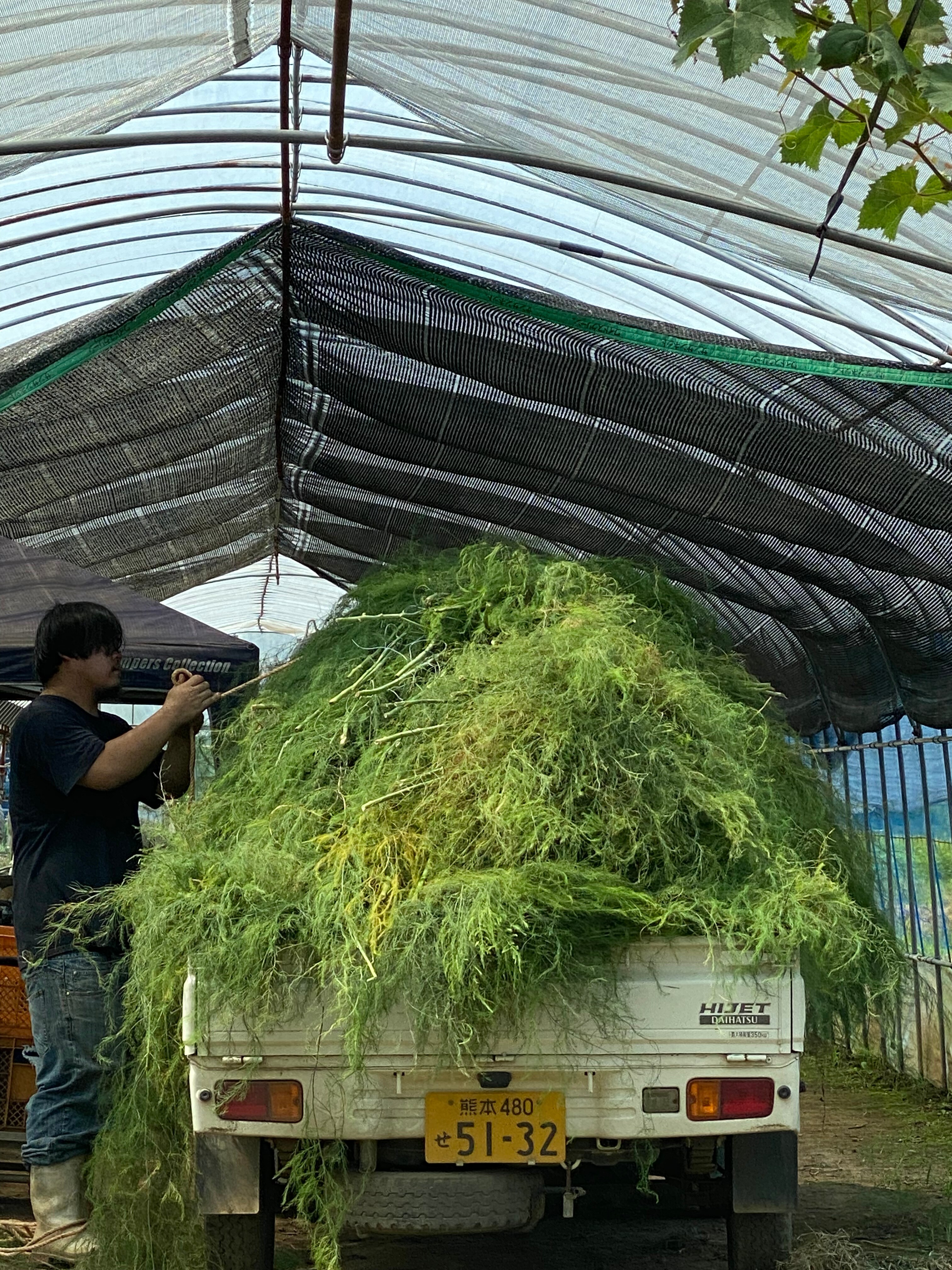刈り取ったアスパラガスをトラックで運びだした様子。