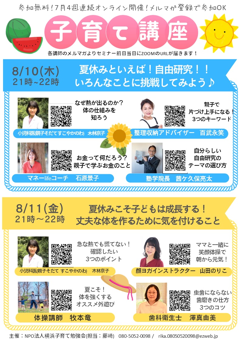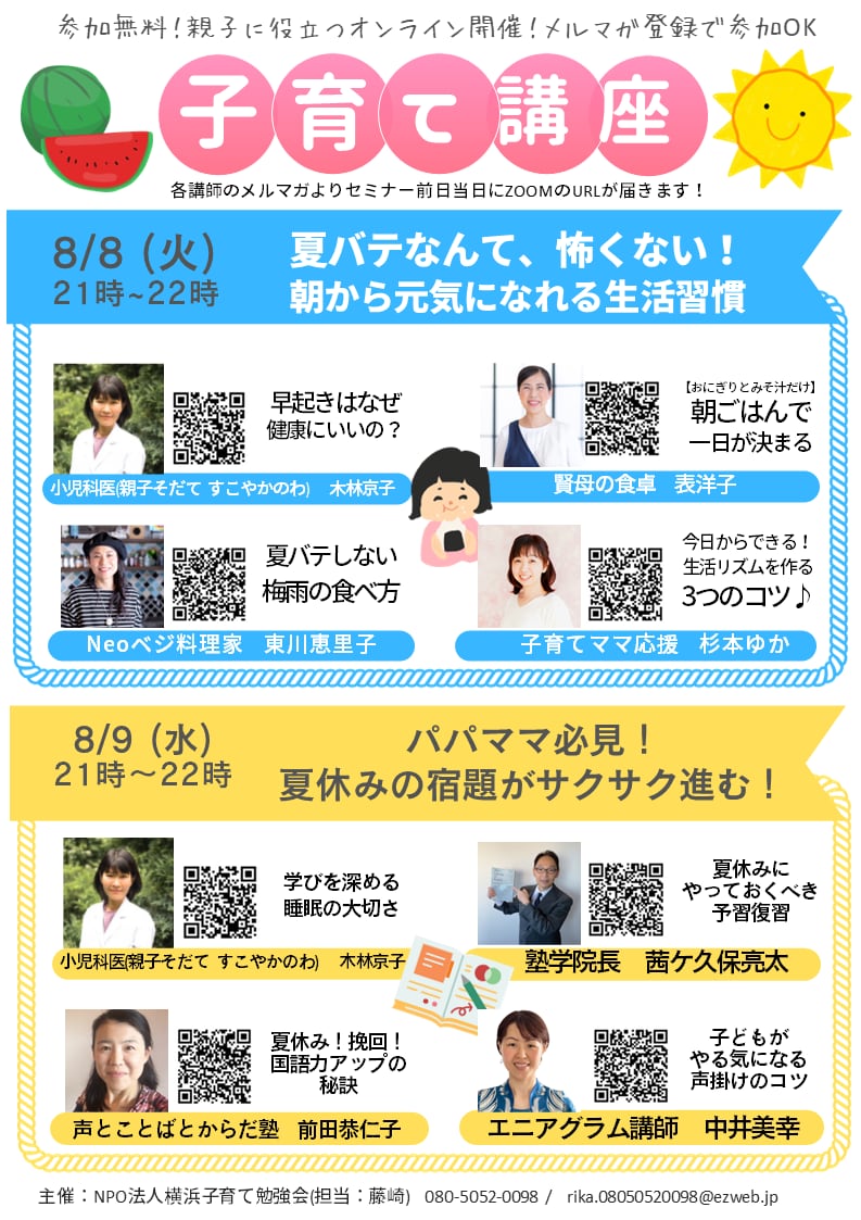 親子で楽しい充実した夏休みにするためにNPO法人子育勉強会主催のオンライン子育てセミナーを皆様にお送りさせていただきます。