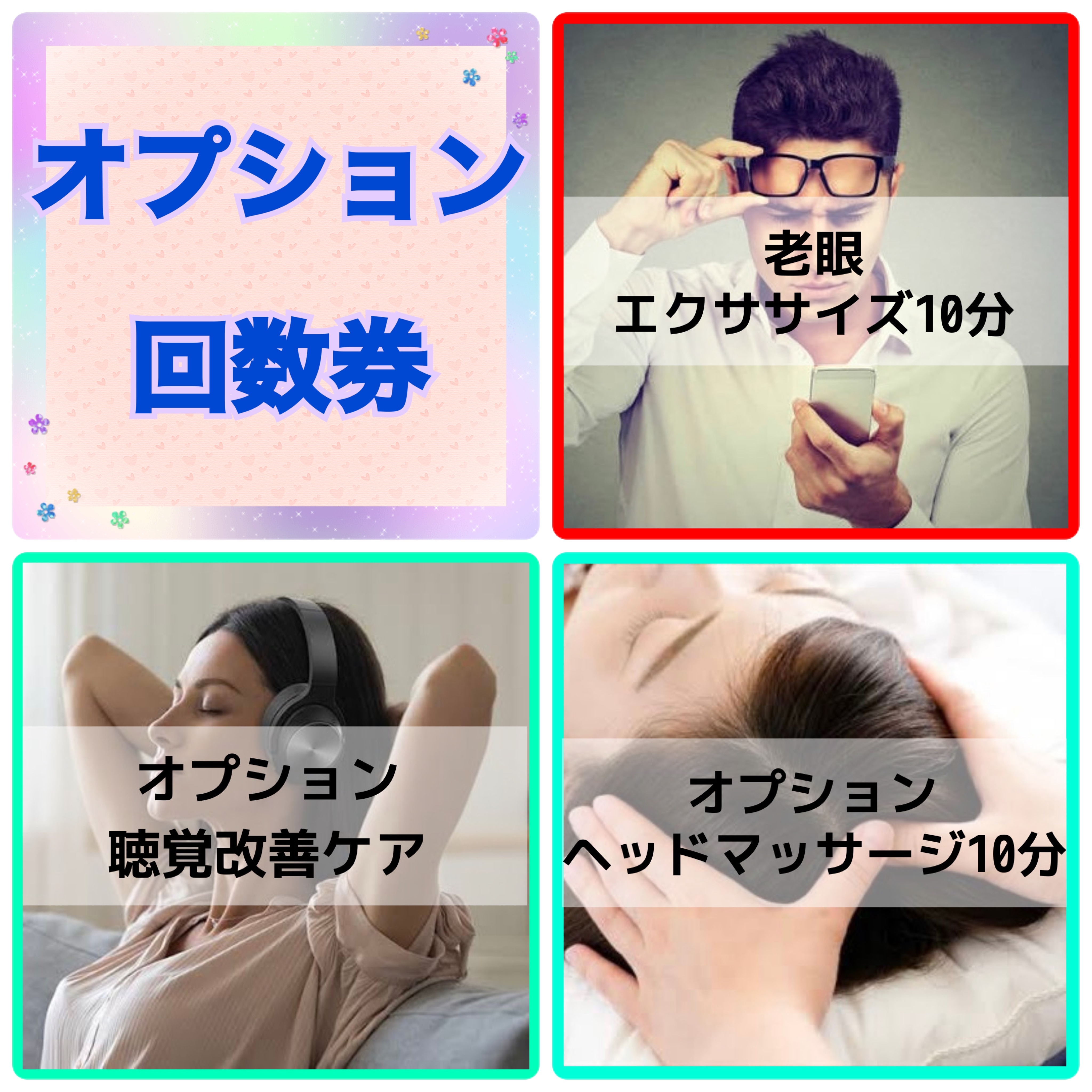 ・ベッドマッサージ ・聴覚改善ケア ・老眼エクササイズ ・延長15分 こちらの中からお選びいただけます。 有効期間はご購入より1年間です。 ご予約の際にご希望のオプションをおっしゃってください。