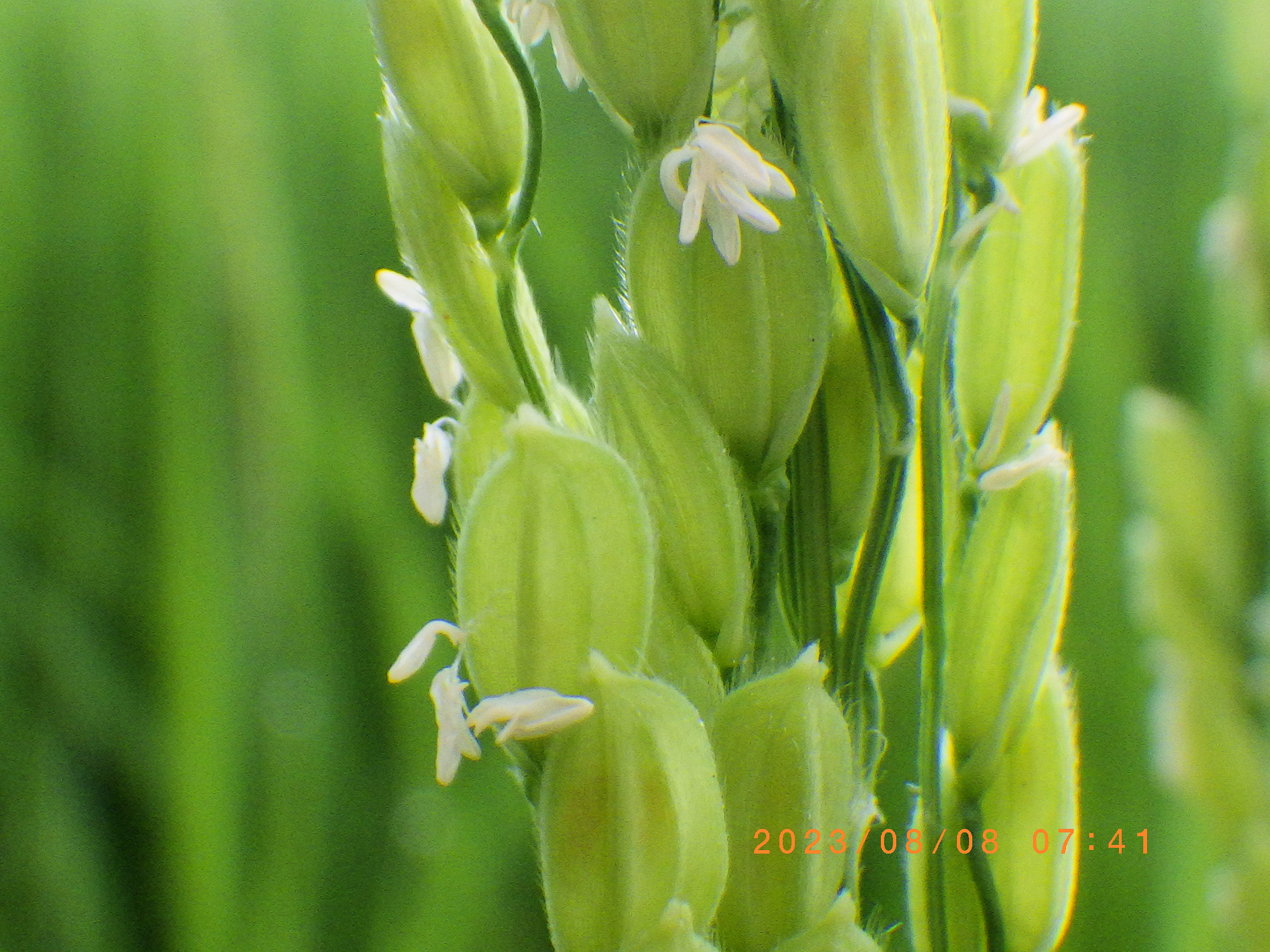 この花が咲くには光と温度の条件が決まっていて、穂の先のほうから下へ順に何日かかけてひっそり咲き、めしべは2つに割れた籾(もみ)の中に隠れていて、2時間ほどで咲き終わり、籾(もみ)は閉じてしまうのだそうです。