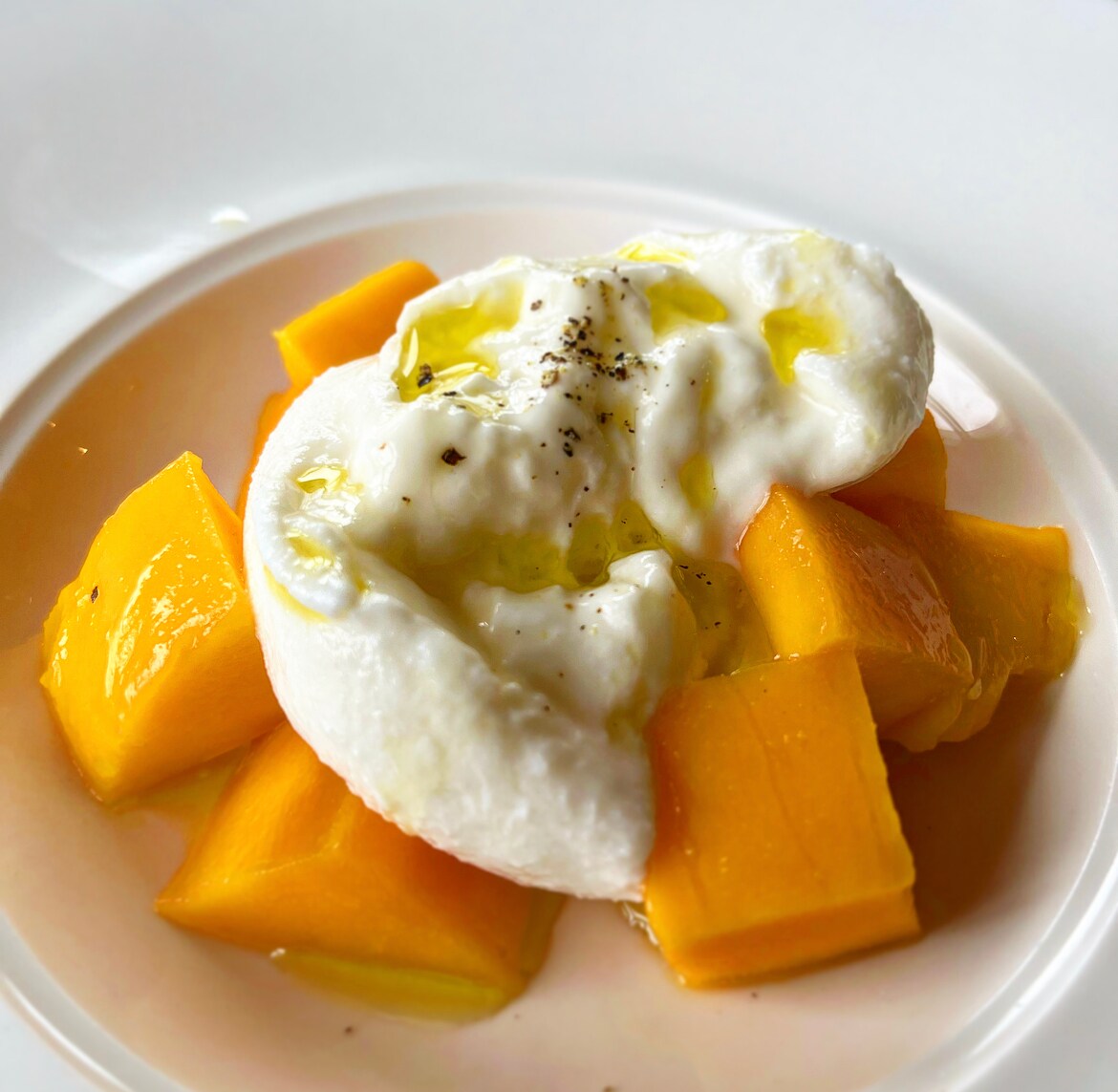 めちゃくちゃ美味しい無農薬マンゴーとモッツァレラチーズに生クリームを包んだブラータチーズの共演✨