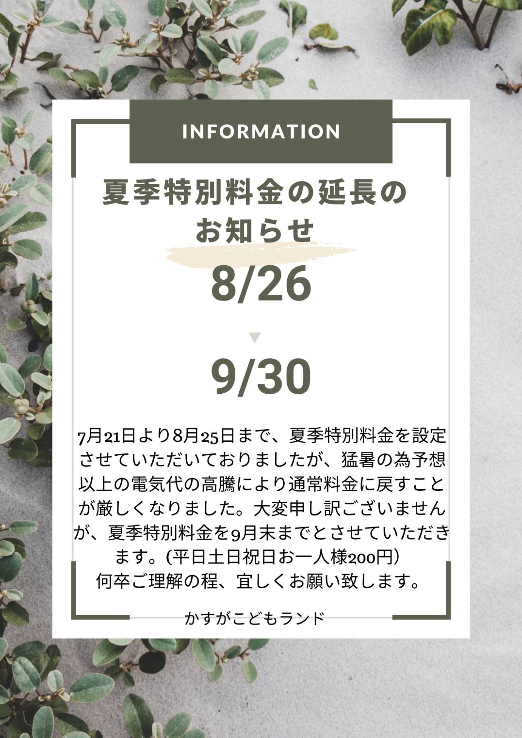 かすがこどもランド夏季料金延長のお知らせ🙇