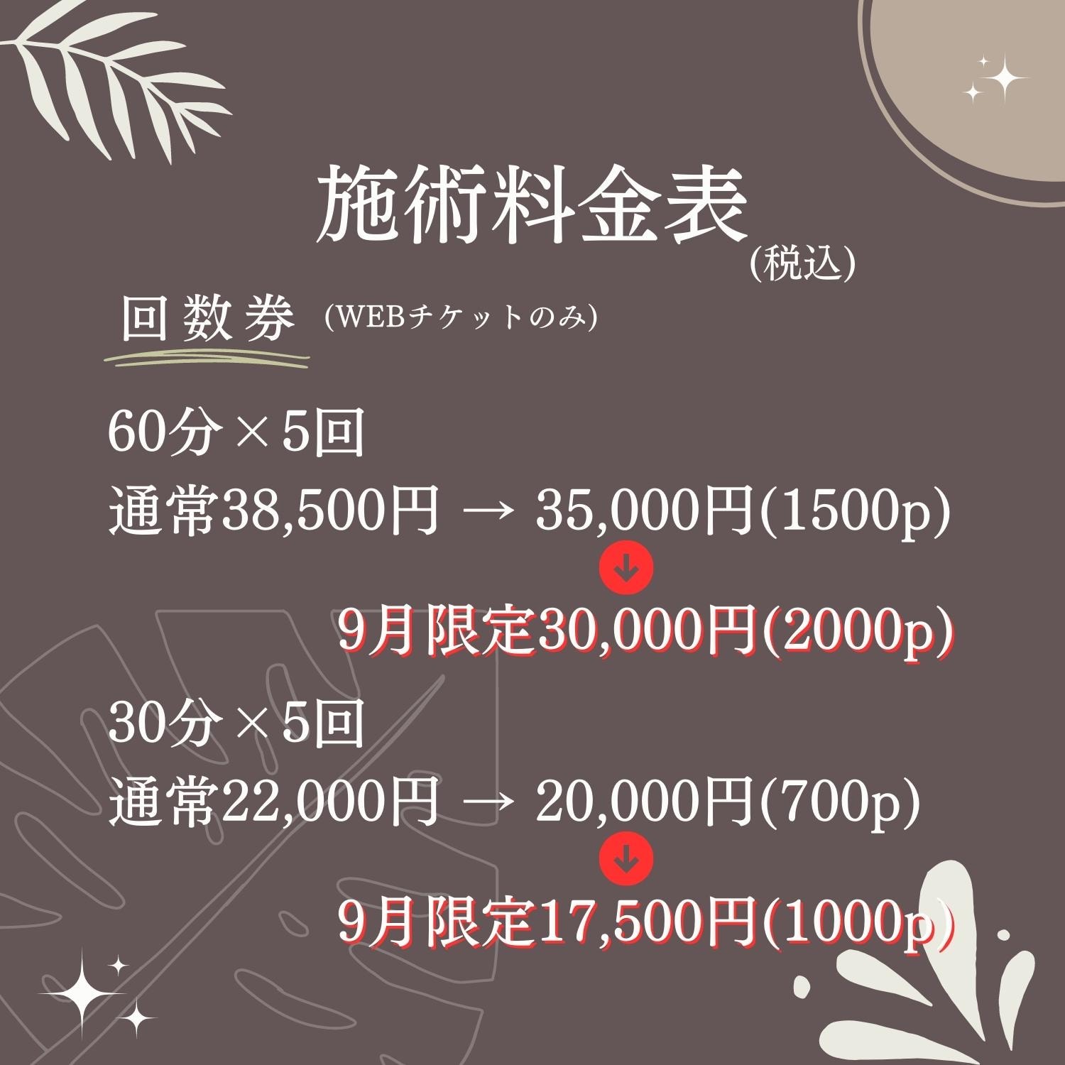 大変心苦しいお願いとなりますが、検討を重ねた結果10月のリニューアルを機に、施術料金を改定させていただくことになりました。何とぞご理解のほどお願いいたします。
