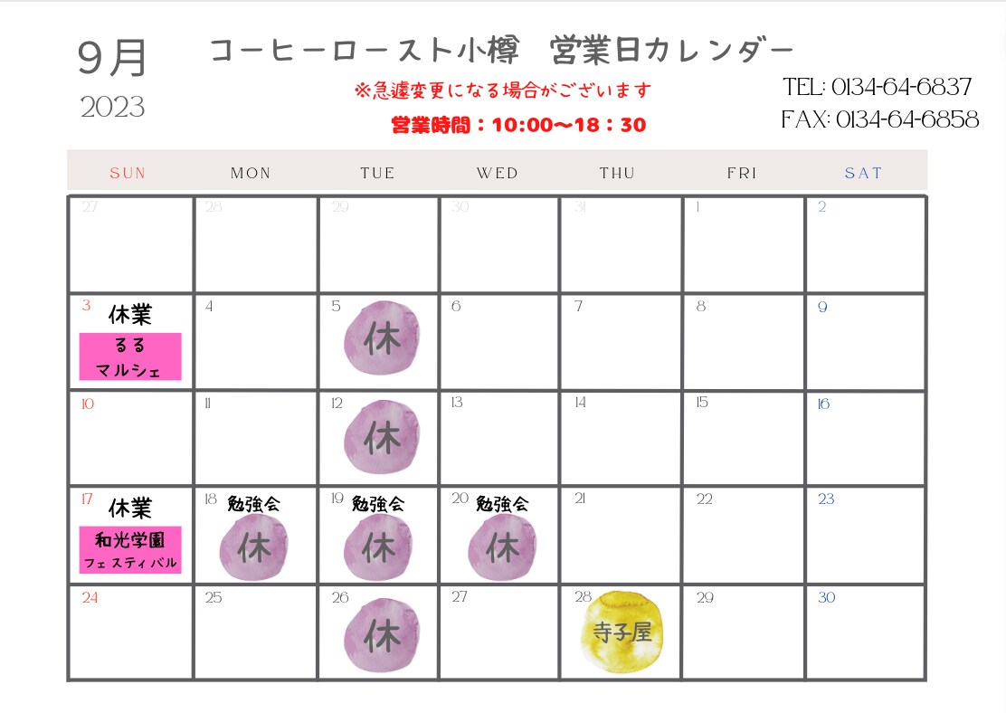 コーヒーロースト小樽 ☆9月のお知らせ☆