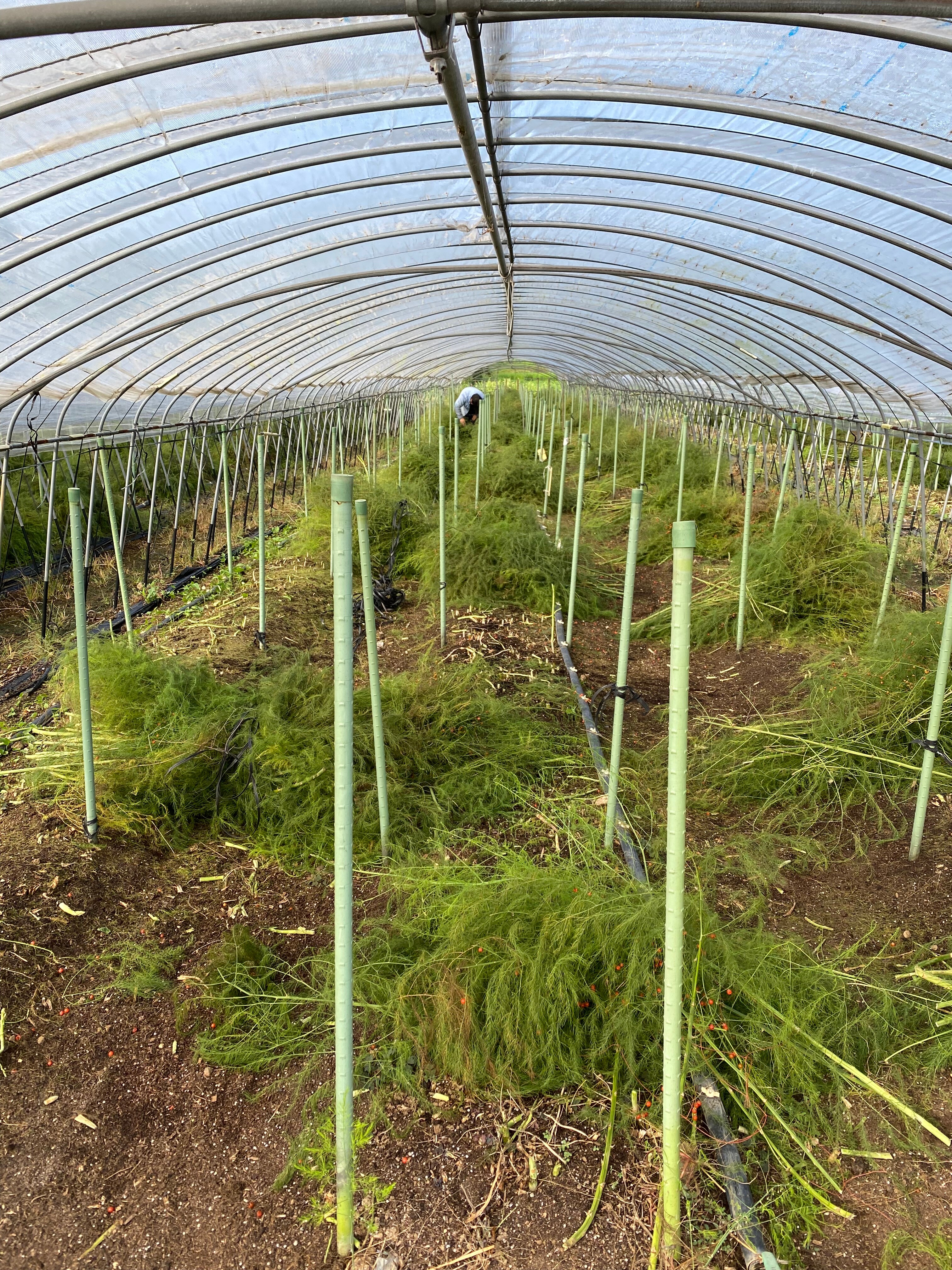 ビニールをひとたび剥がすと、雨に打たれたアスパラは、すぐ病気になる為、消毒!その上、炎天下のなか、ビニールハウスを貼る作業、遮光ネットを貼る作業。それによる、雑草繁茂。もー大変でした。我が家に、熱中症の病人が出るのではないかとヒヤヒヤしました。(それでもやら無い訳にはいかないんです。ホントに残酷。)