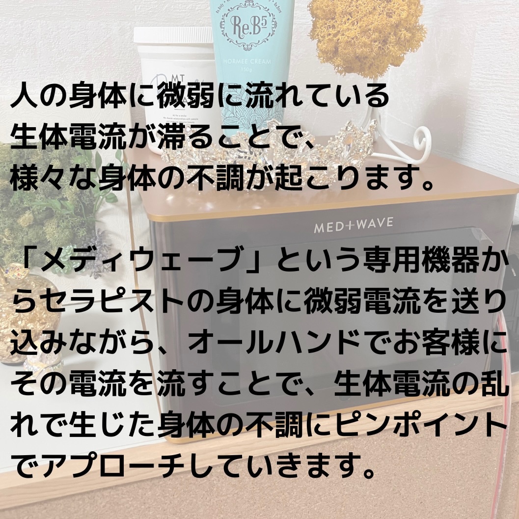 メディセラピー専用機器からエステティシャンの身体に微弱電流を送り込みながら、オールハンドでお客様にその電流を流すことで、生体電流の乱れで生じた身体の不調にピンポイントでアプローチしていきます。自律神経のバランスを整え、不調を改善することで基礎代謝・基礎体温を上げ、肩こり首こりや腰痛が和らぎ、疲れがとれます。そして、ムダな脂肪を自然と落とせる身体作りを目指していきます。そして身体の内側から生み出される本質的な健康と美をもたらします。
