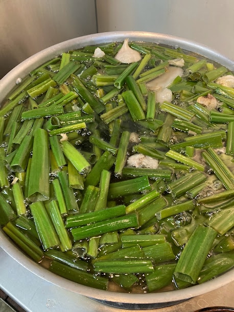冷たい油の中にたっぷりの青ネギ、にんにく、しょうが