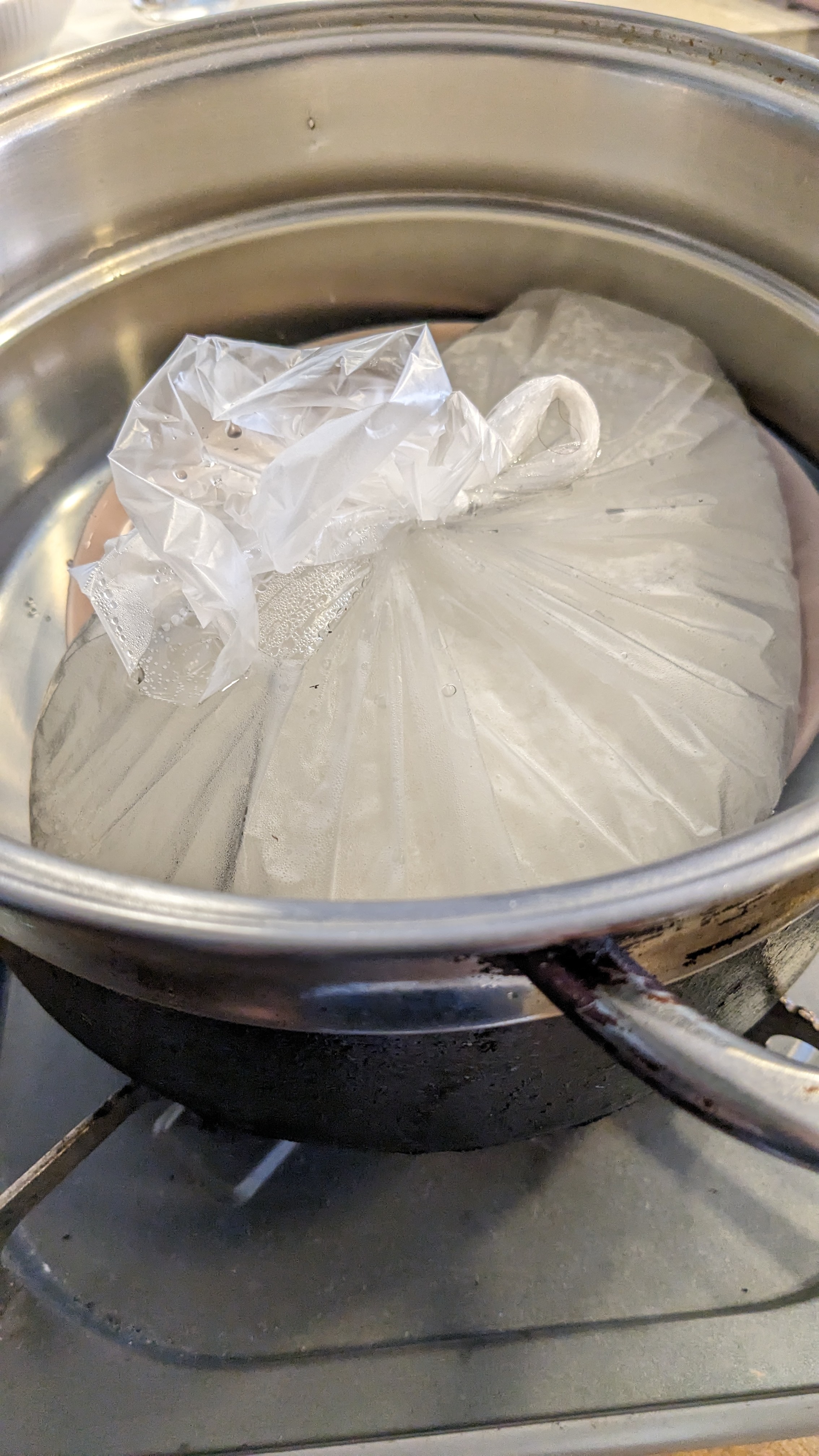 耐熱のポリ袋とカセットコンロを使って、白米を炊いてみました。