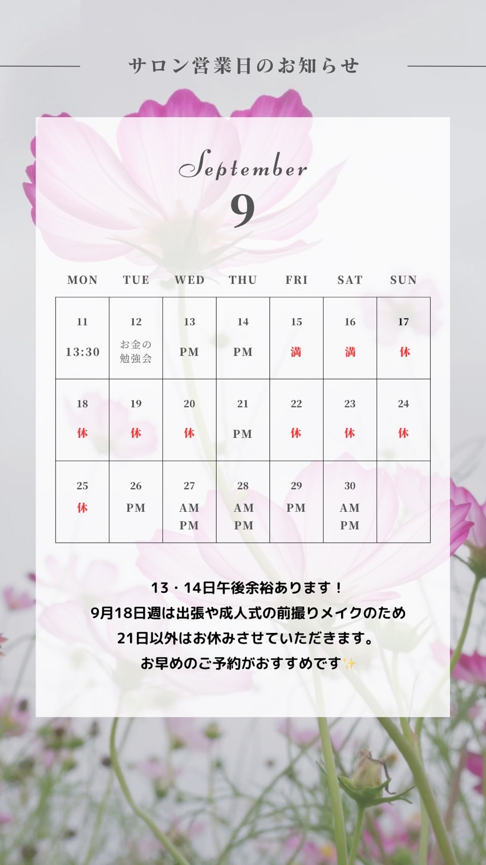 今月は東京出張と成人式の前撮りメイクで9月18日週の営業日が1日のみとなっております。