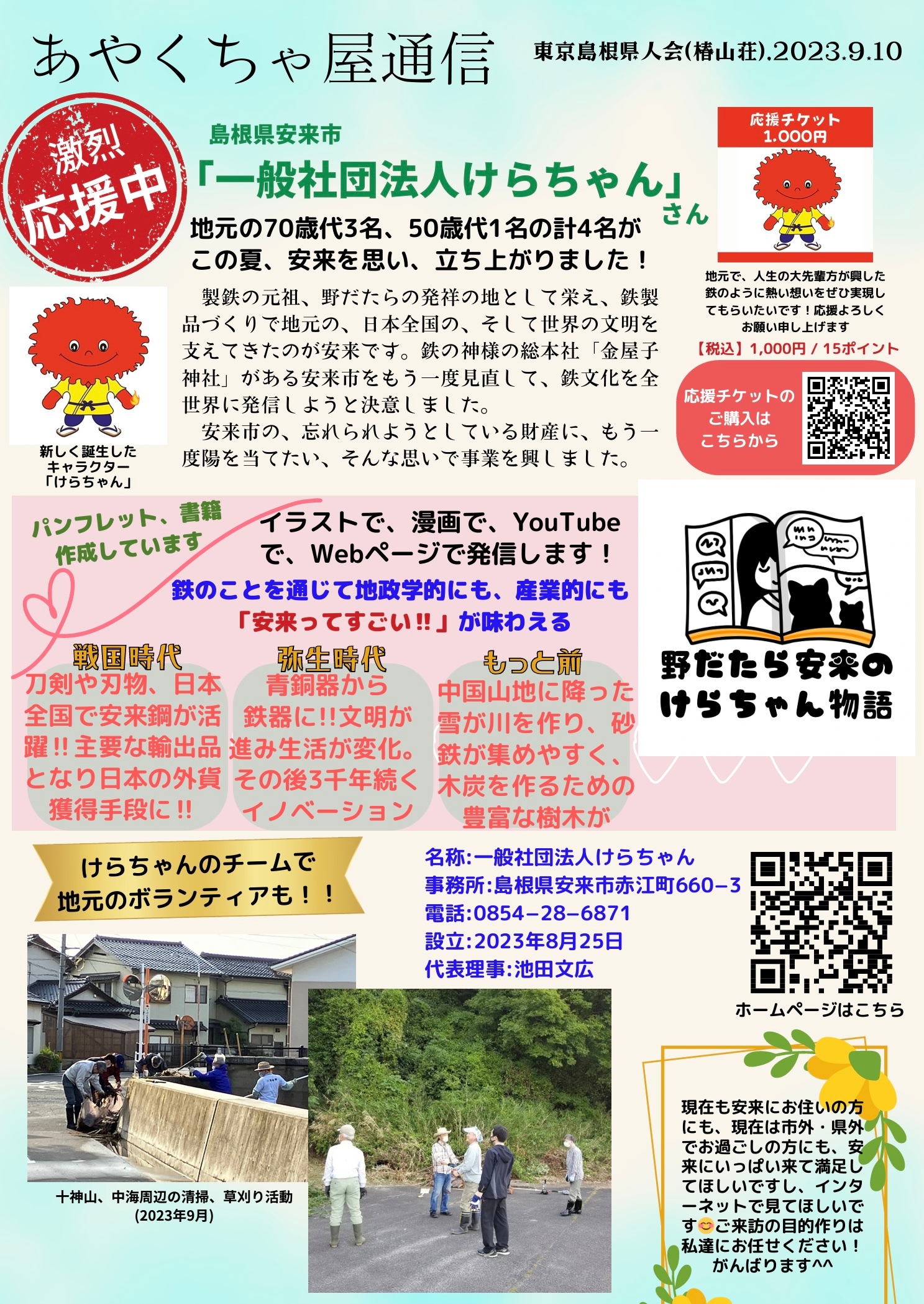 あやくちゃ屋では、ご縁のある島根を元気にして、安来で2泊3日の旅行ができるぐらい魅力的な町にしようというこの取り組みを応援します。当店でけらちゃんの応援チケットを販売しておりますが、収益の全額がけらちゃんに寄贈されます‼️
