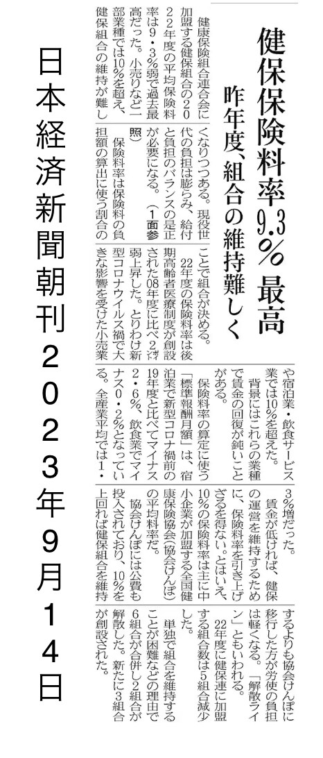 平均の健康保険料率が9.3%で過去最高との事。