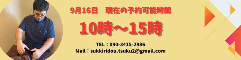本日の予約可能時間をお伝えする前に、来週の18日(月)、19日(火)、20日(水)は東京の方へ行かせていただきますので、すっきり堂はお休みとさせていただきます。ご予約される方はご注意をお願いします。