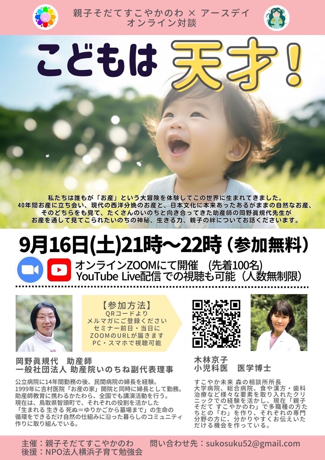 子どもさん一人ひとりのもつ個性や才能、そして、女性の一生(思春期・出産期・更年期などゆりかごから墓場まで)を見つめ続けていらっしゃる岡野さんのお話を無料でお聞きいただける、貴重な機会になります。