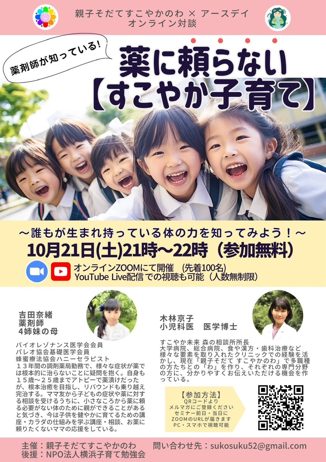 来月10月は、薬剤師の吉田奈緒さんに『薬剤師は知っている 薬に頼らない【すこやか子育て】』~誰もが生まれ持っている体の力を知ってみよう!~