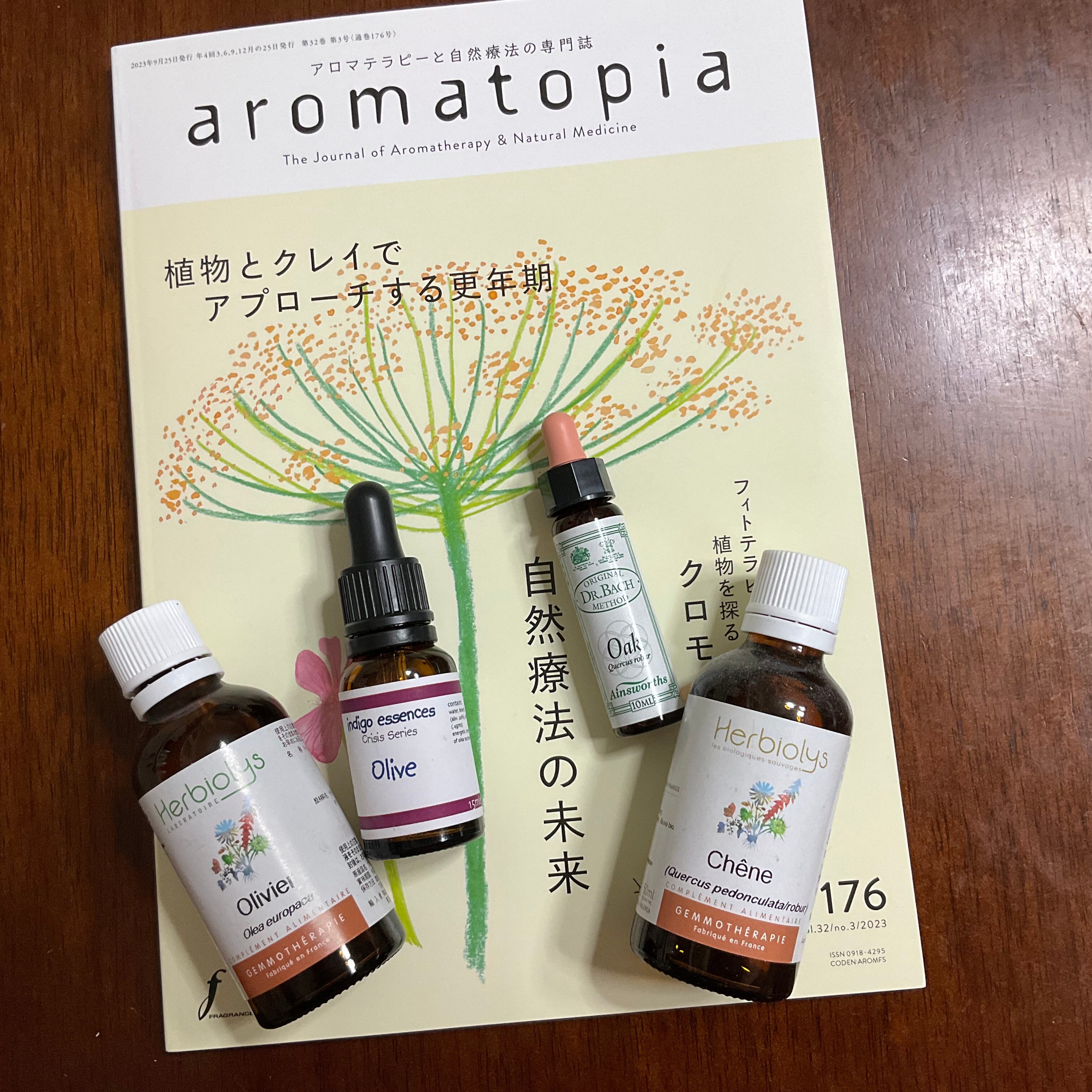 そんな山本竜隆先生と一緒に統合医療を実践した日々を思い出しつつ、次の先生の「自然療法の未来」にいくと、明日、オンラインで一緒にオリーブ&オークを紹介してくださる東昭史先生が「バッチ博士の哲学」を伝えていく使命を伝えていらっしゃるので、アロマトピア176号と一緒に、オリーブ&オークのエッセンス群をアロマトピアと一緒に撮影してみました。