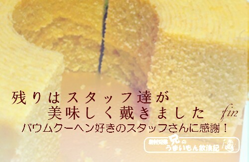 このおなかに溜まる感じ、一切れでだいぶ幸せになれますね。 バウムクーヘン好きのスタッフさん、美味しいもの食べさせてくれてありがとう! |