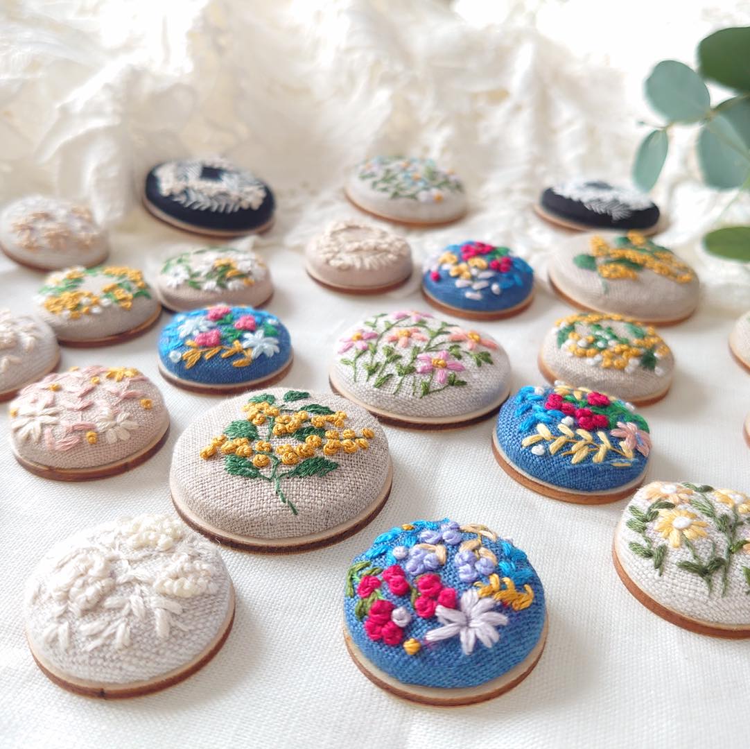 手刺繍のブローチを制作してます。おしゃれのアクセントに取り入れていただけるとうれしいです♡