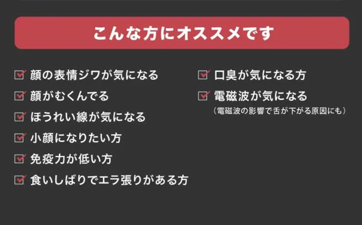 光量子加工されたマジカルマスクを着用するだけで歯茎のマッサージを受けた後のように口の中が軽くなり、舌が上がる仕組みになっています👅