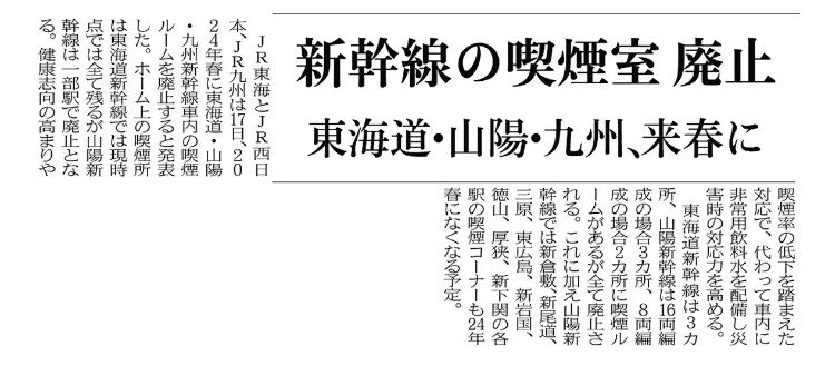 東海道・山陽・九州新幹線車内の喫煙ルームが来年春になくなるそうです。