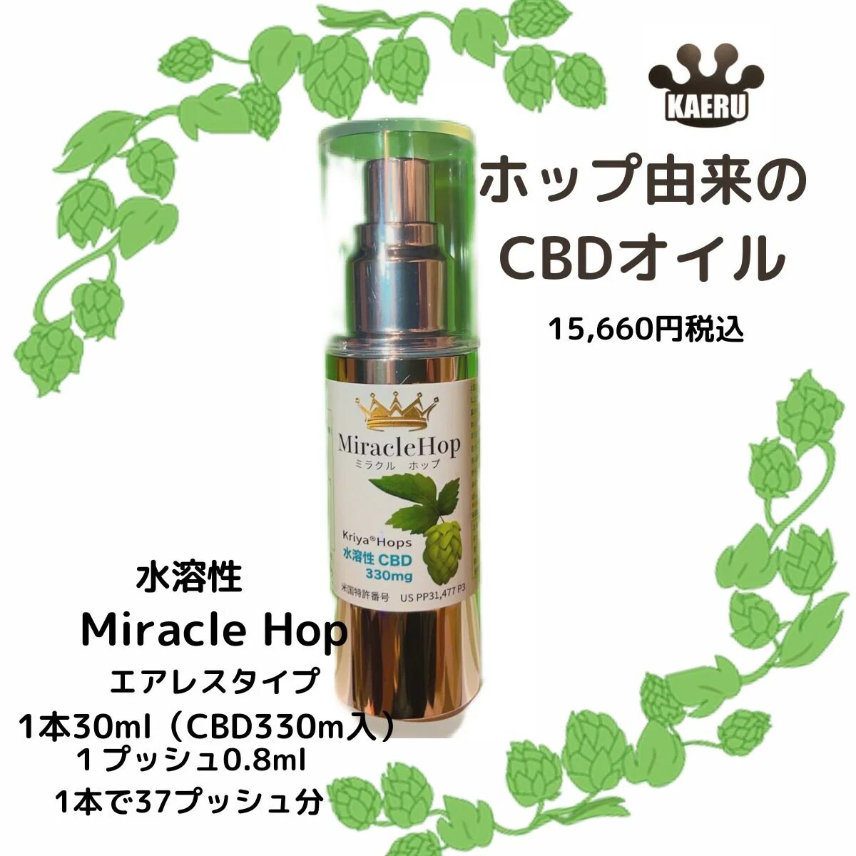 CBDオイル水溶性ホップ由来【1本30ml/CBDオイル330mg配合】直接、口に1プッシュでご使用も可能ですが、