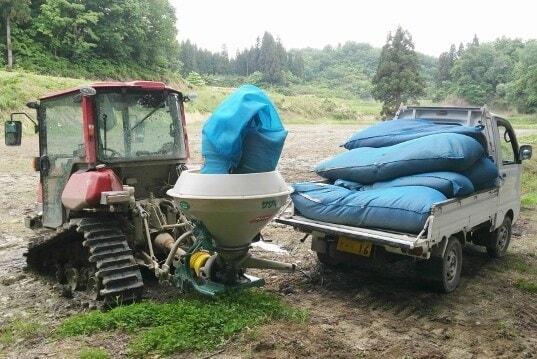 有機肥料やもみ殻を田んぼに散布をして、