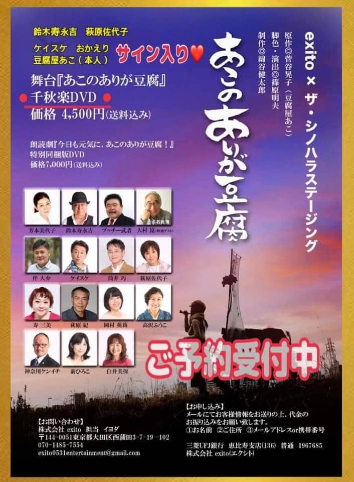 豆腐屋あこちゃんは、20年間リヤカーで引き売りしなんで生きているんだろう・・と看取り士の資格を持ちながら活躍しているあこちゃん。先日まで、あこちゃんモデルの「ありが豆腐」が千秋楽で公演されケイスケさんも役者として活躍されていました。