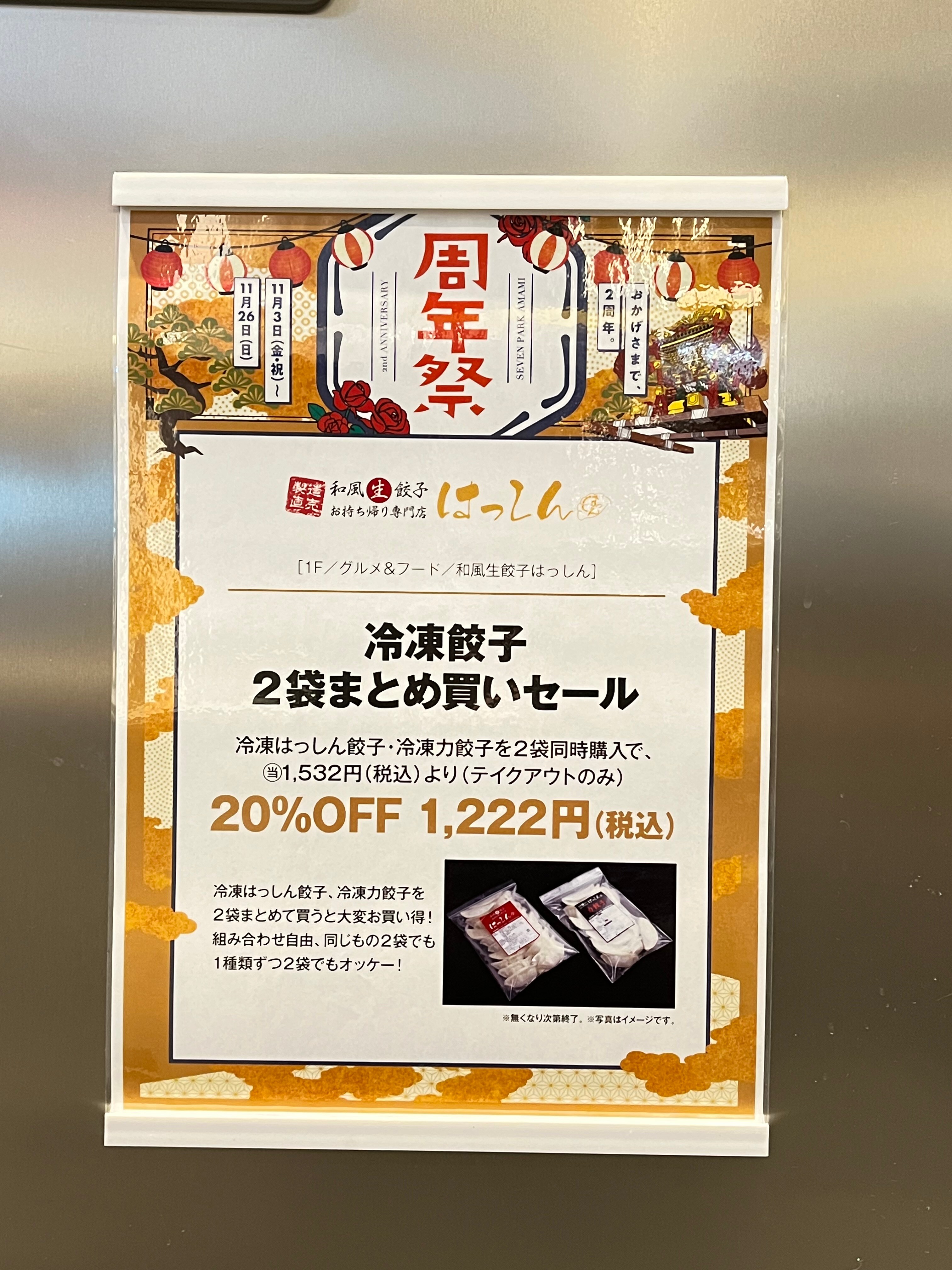 しかも、セブンパーク天美店では、冷凍餃子2袋で20%OFFのセール開催中です!!