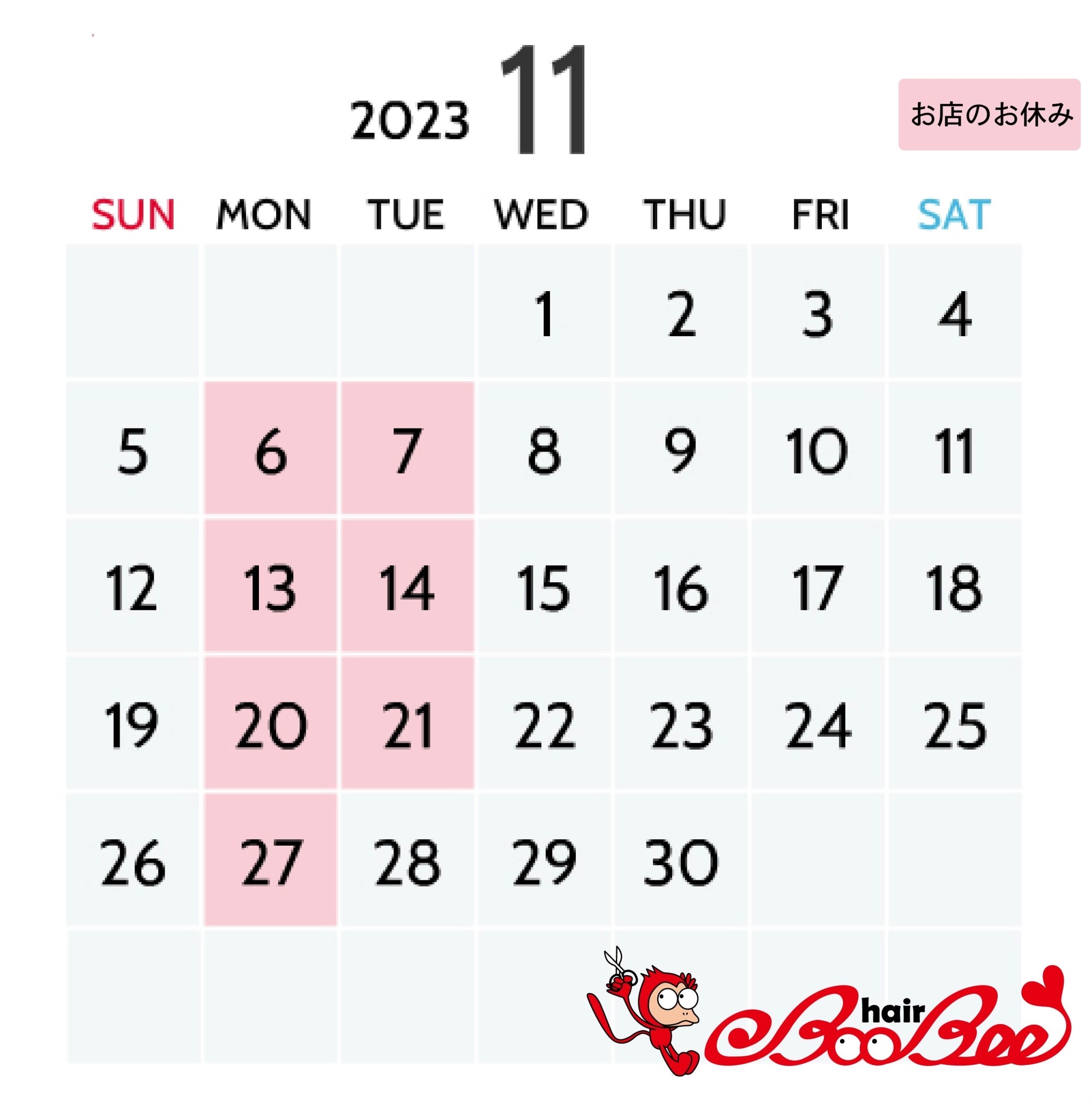 《ヘアーブービー》11月のお休みです