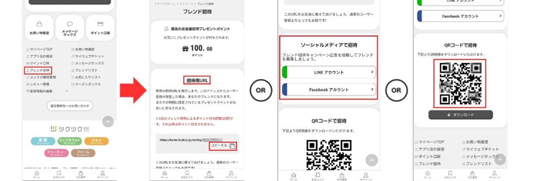 or フェイスブック)でシェアしても、QRコードを読み込んでいただいてもどれでもOKですので、ご家族様・お友達が登録完了しますとお互いに100pt.