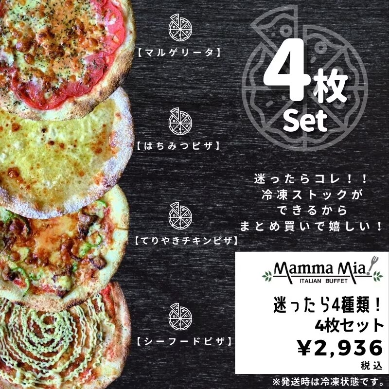4枚ピザセット【マルゲリータ/はちみつピザ/てりやきチキンピザ/シーフードピザ】※冷凍でお届け切れ目入り包丁要らず/イタリアンビュッフェレストランマンマミーア[ピザ通販]