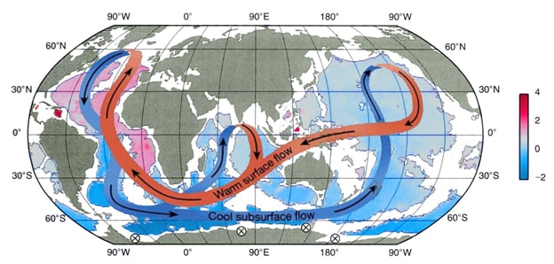 (画像出典:北海道大学 大学院環境科学院地球圏科学専攻 大気海洋物理学・気候力学コース『塩のさじ加減で決まる海洋大循環』海洋大循環の概念図。赤(暖かい表層海流)と青(冷たい深層海流)のリボンは海洋大循環を、海の部分の水色やピンクの領域は海底付近における水温の分布を表す。水温は右側にあるスケールで示される)