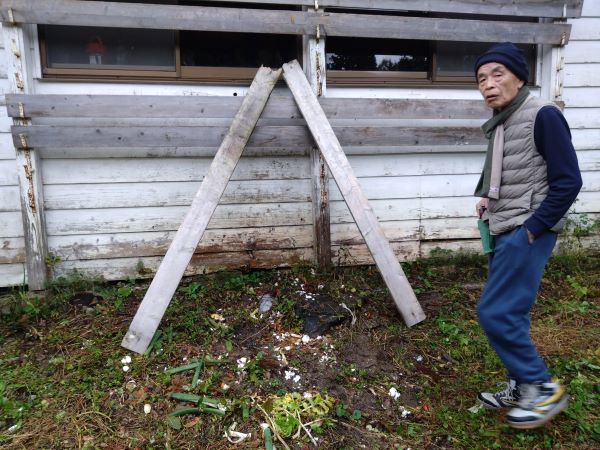 <台所から侵入を試みる>クマが上ったらしく、雪囲い板が折れる。